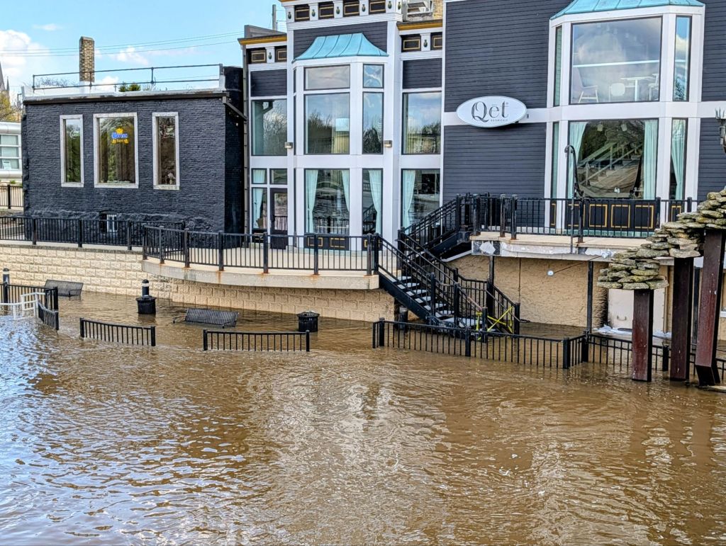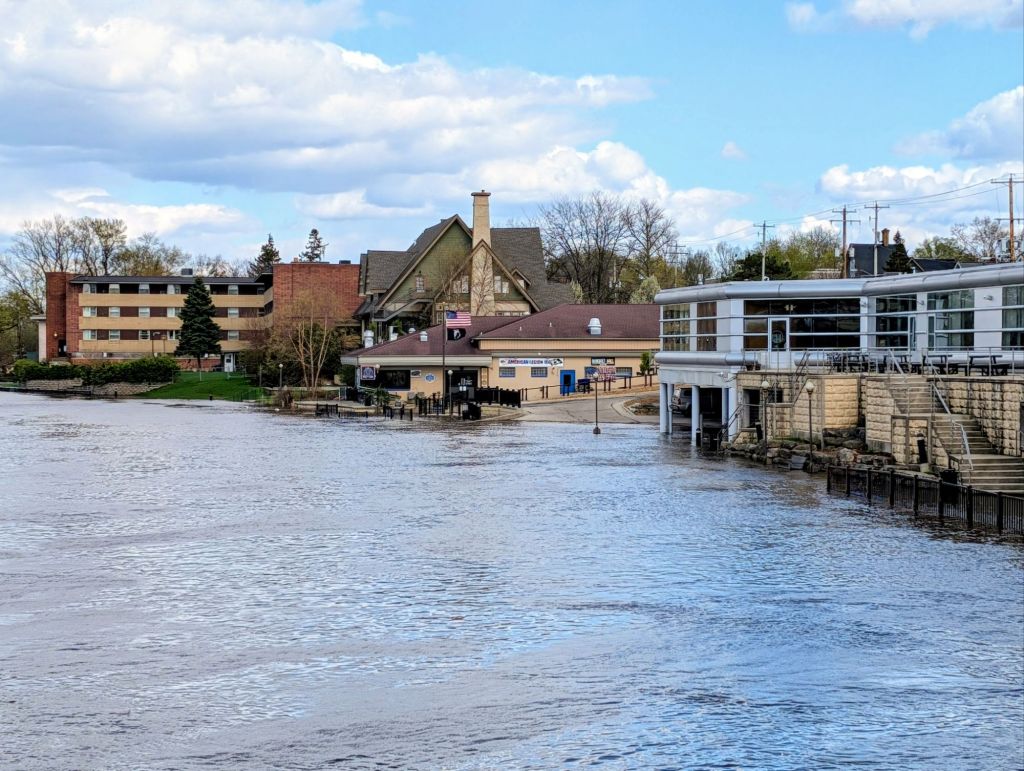 We actually landed in MKE half an hour early. Which would’ve been great if Tara hadn’t been delayed an hour due to a closed freeway. Last week’s storms brought over 5″ of rain, and there is extensive flooding throughout southern Wisconsin. This is the Rock River in Fort Atkinson; the water along the river walk is probably waist-high.