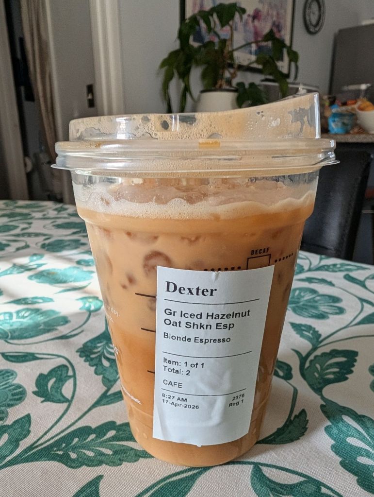 Y’all know I like to give a fake name when ordering. My current go-to is Dexter, so after ordering my Iced Brown Sugar Oatmilk Shaken Espresso (god, I’m fancy), that’s the name I gave the cashier.